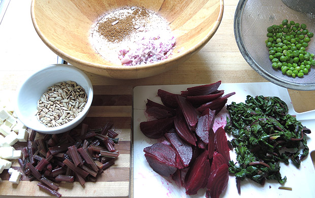 Wash the beets and beet greens separate. Cook the beets in salted water to cover until tender approximately 30 minutes depending on size. Use a fork or knife to test doneness, let cool slightly and rub off the skins and tails. Cut beets into 1/8″ thick wedges and set aside. Meanwhile cut the leaves off the stems and cook both separately for about 5 minutes in a fresh pot of boiling salt water. When done strain through a sieve, cool down with running tap water and chop into bite size pieces (see picture). Cook peas the same way, if using.