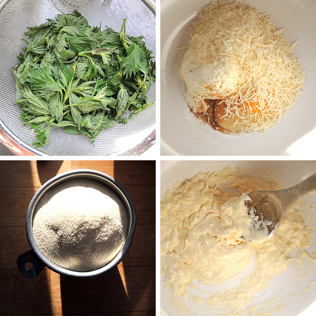 Ricotta oder Quark, Käse, Ei und Gewürze gut miteinander vermischen. Das Mehl und die gehackten Nesselblätter hinzufügen und ebenfalls unterrühren. Die Teigkugel etwa 1/2 Stunde abgedeckt ruhen lassen.