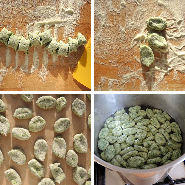 Die Kugel in 4 Stücke teilen und in daumendicke Würste auf einer gut bemehlten Arbeitsplatte ausrollen. Die Würste in 2 cm Abschnitte unterteilen und mit dem Finger platt drücken, jetzt auf ein mit Semolinamehl bestreutes Backblech geben. Genauso mit dem restlichen Teig verfahren. Das aufbewahrte Kochwasser von den Brennesselspitzen wieder zum kochen bringen, salzen nicht vergessen.