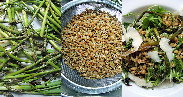 Den Backofen auf 200°C vorheizen, ein Backblech mit Backpapier belegen und bereit stellen. Den Grünkern in kochendem Salzwasser etwa ein halbe Stunde garen, abschütten. Während dessen aus Sojasauce, Zitrone, Salz, Pfeffer und Olivenöl ein Dressing rühren. 2/3 des Dressings auf den noch warmen Grünkern in einer Schüssel geben und gut vermischen. Die vorbereiteten Spargel und Zwiebeln auf einem Backblech ausbreiten und mit dem restlichen drittel des Dressings gleichmässig beträufeln. Im Ofen bei Oberhitze etwa 20 Minuten grillen bis ein paar braune Stellen zu sehen sind. Mit dem Grünkern in der Schüssel vermischen und alles etwas abkühlen lassen (noch lauwarm ist ok). Den Rucola untermischen und mit Parmesanspänen bedeckt servieren.