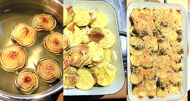 Eine grosse flache ofenfeste Backform mit Öl beträufeln. Die Artischocken einzeln aus dem Wasser holen und schnell in dünne Scheiben schneiden. Jetzt die Artischockenscheiben abwechslend mit den Kartoffelscheiben in die Form schichten, die Hälfte der Knoblauchscheiben darüber verteilen. Die erste Lage mit Salz und Pfeffer würzen und etwas Öl darauf träufeln. Die zweite Lage genauso hinein schichten. Am Schluss oben drauf Brotbrösel und Parmesan streuen. 4 EL Wasser am Rand in die Backform geben damit es beim backen nicht zu trocken wird. Im Backofen bei 200°C etwa 1 Stunde backen bis sich oben eine schöne braune Kruste gebildet hat.