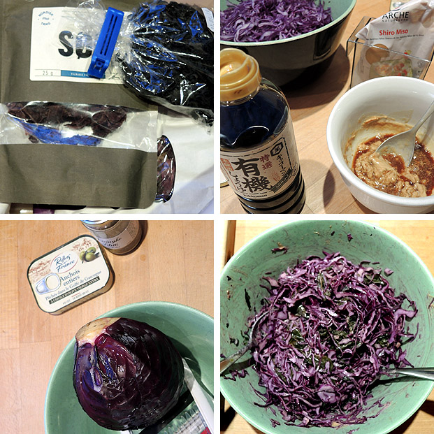 In einer separaten Schüssel das Dressing aus Sesampaste, Reisessig, Miso, Shoyu und den Anchovies anrühren. Seetang abschütten und mit dem geschnittenen Kohl vermischen. Dressing über die Mischung verteilen und gut durchmischen. Mit Zitrone abschmecken und (wer mag) mit Furikake bestreut servieren.