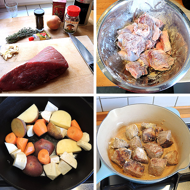 Rindfleisch in 5 cm grosse Würfel schneiden. In einer Schüssel in Mehl das mit Salz und Pffer gewürzt wurde wenden, herausnehmen und überschüssiges Mhel abklopfen. In einem grossen Schmortopf das Öl erhitzen und die Fleischwürfel darin von allen Seiten anbraten. Dabei nicht zuviel in die Pfanne legen, eventuell portionsweise vorgehen, damit die Würfel auch etwas Farbe annehmen und nicht dünsten. Das Fleisch auf einem Teller zwischenparken wenn es fertig gebräunt ist.