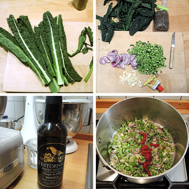 Die Schwarzkohlstiele in 1/2 cm dicke Ringe schneiden, die Blätter in 2 cm breite Streifen schneiden. Das Olivenöl in einem Topf erhitzen und erst die Stielstücke etwa 5 Minuten andünsten. Dann die Blattstreifen, Zwiebel und Knoblauchstücke dazugeben und 5 Minuten weiterdünsten. Tomatenpaste zugeben und gut unterrühren, dann die Linsen zugeben und alles mit Brühe aufgiessen. Salz zugeben und alles zusammen etwa 40 Minuten sanft köcheln lassen, probieren ob die Linsen gar sind, ansonsten noch etwas länger garen.