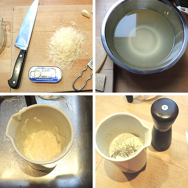 Zitronensaft, Parmesan, Sardellen, Knoblauch und Worchestershiresauce kurz in einer Schüssel mit dem Mixer pürieren. Dann zu der Mayonaise geben und verrühren. Mit Salz und Pfeffer abschecken. Schauen ob die Würzung stimmt und eventuell noch mit Zirtonensaft oder Salz/ Pfeffer korrigieren. Kann sofort verwendet werden, hält sich aber im Kühlschrank auch bis zu einer Woche im Glas.